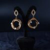 Elegant gold hoop earrings with diamond accents displayed on a black stand
