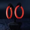 A pair of bold, matte red hoop earrings are showcased on a black velvet jewelry display stand against a dark background.